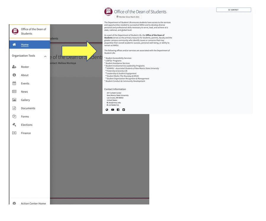 You will see a list of the organizations for which you are in a leadership role leader. (Note: this is ONLY accesible is you have been given administrative privileges through your organization.)