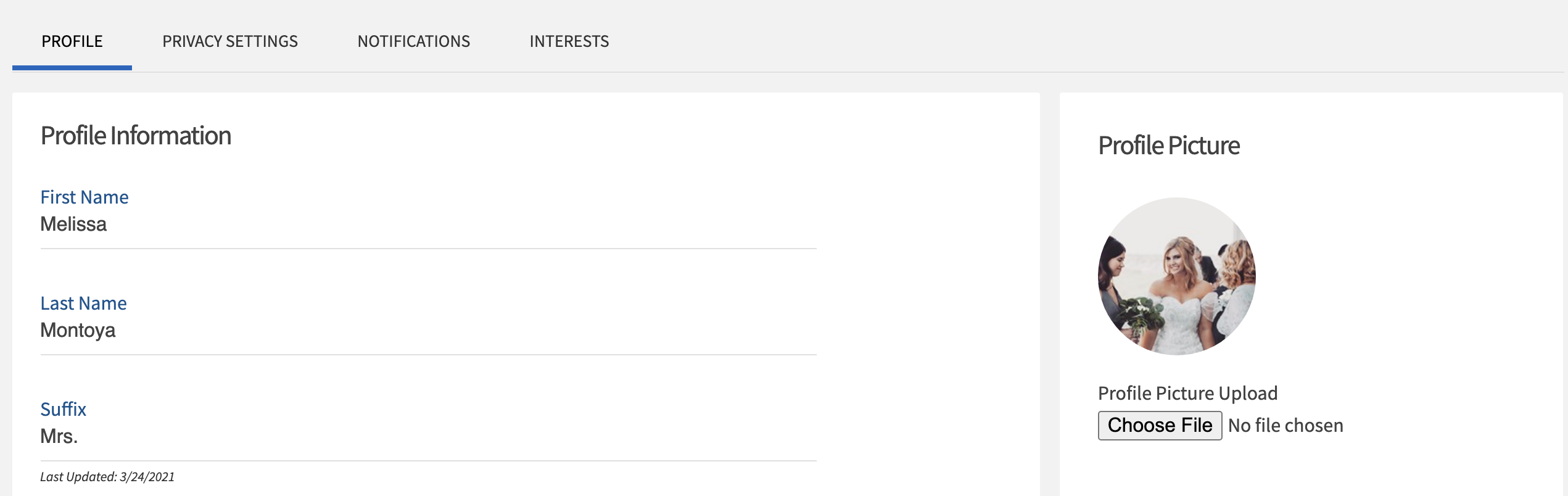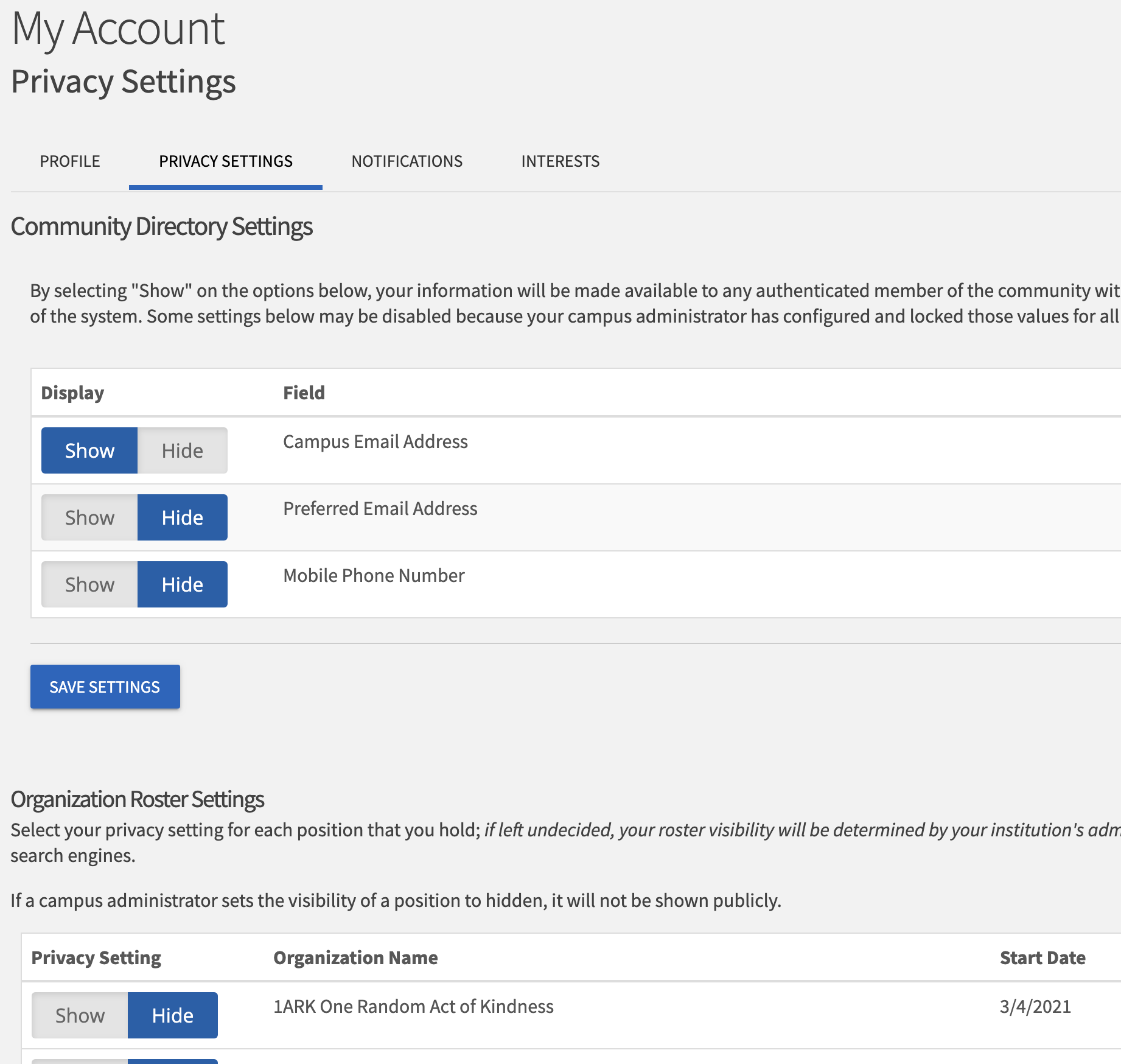 Users can complete their basic profile information, contact information, interests, privacy settings, and notification settings upon logging into the system. See below for detailed instructions on setting up the user profile.