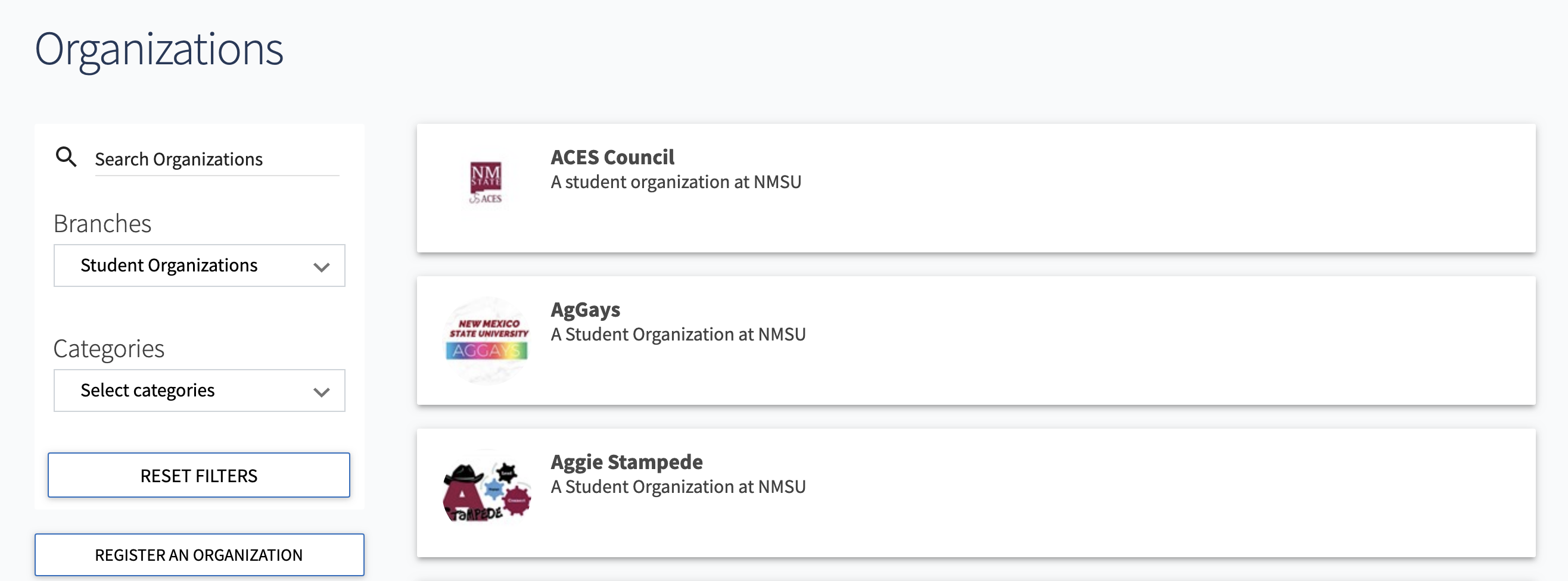 Organizations-shows you registered student organizations on campus as well as residence halls, residence hall communities, and departments in the system.